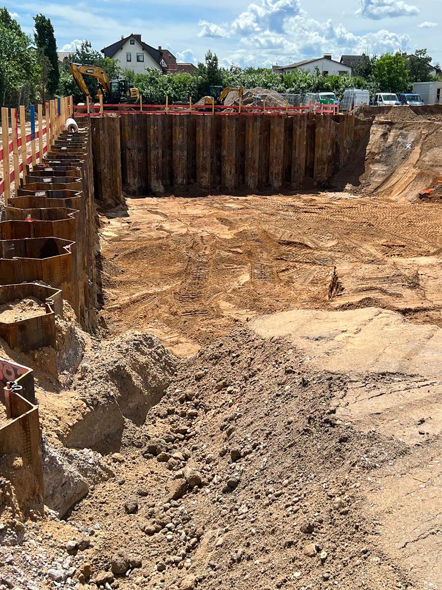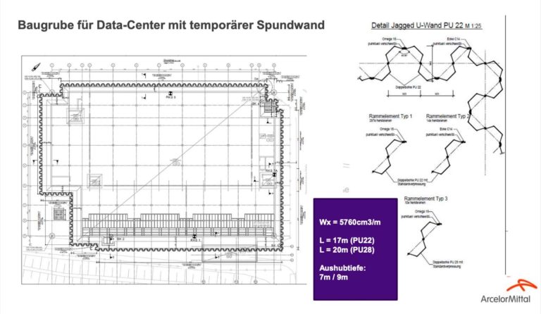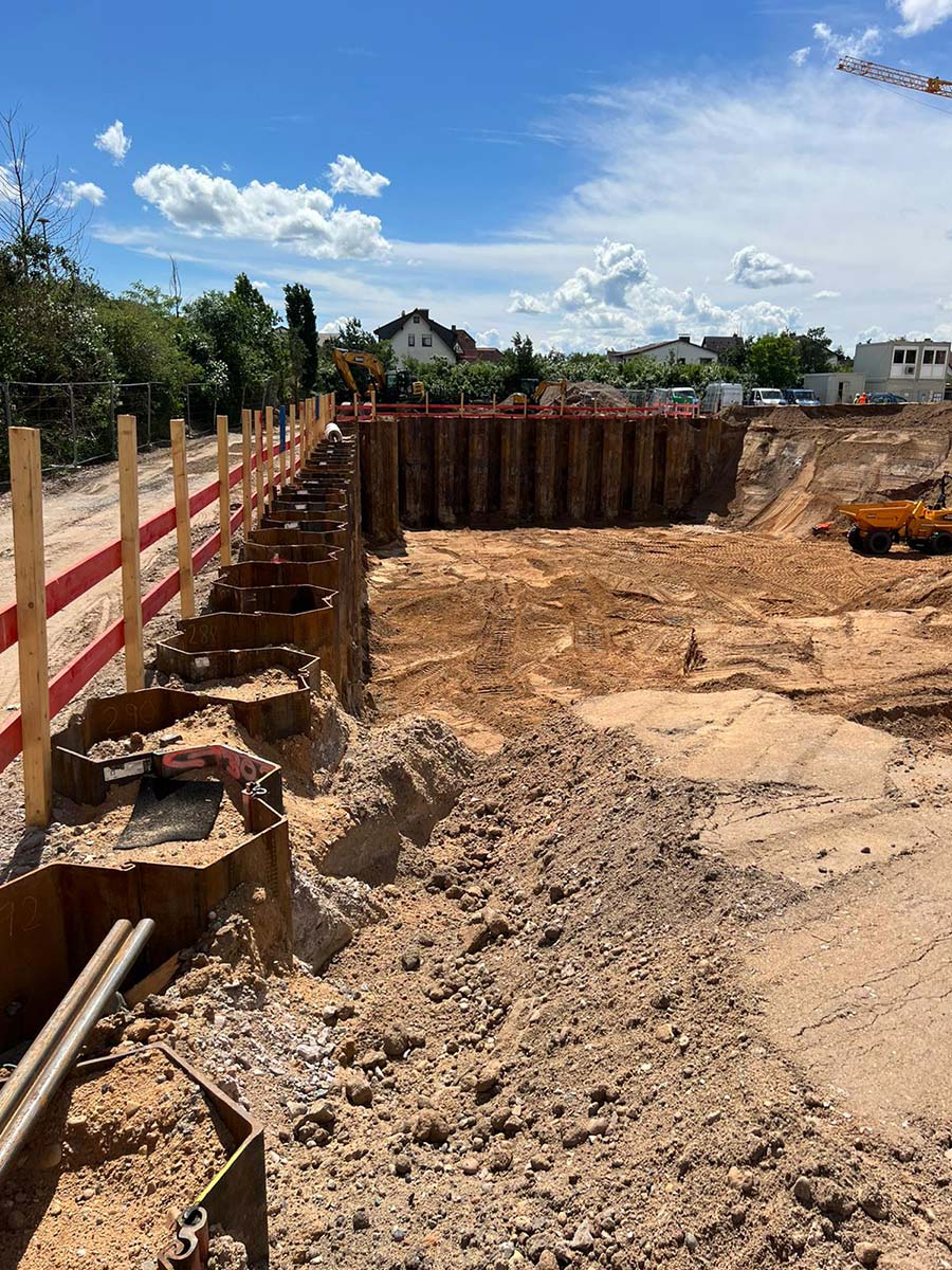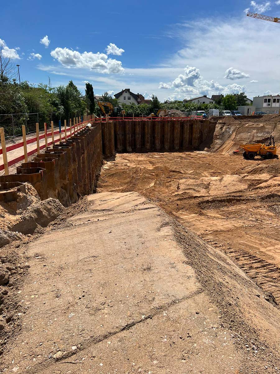 Für den Bau eines neuen Rechenzentrums in Frankfurt/Raunheim wurde die SFS International GmbH mit der Erstellung eines temporären Spundwandverbaus mit einer Gesamtlänge von 324 lfm beauftragt. Die Baugrube wies Aushubtiefen von 7 und 9 m auf, wobei Spundwände mit Längen von 17 m (PU22) und 20 m (PU28) verbaut wurden.