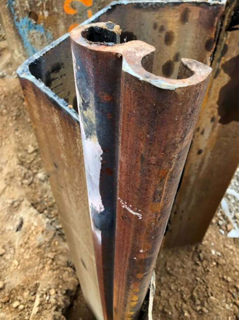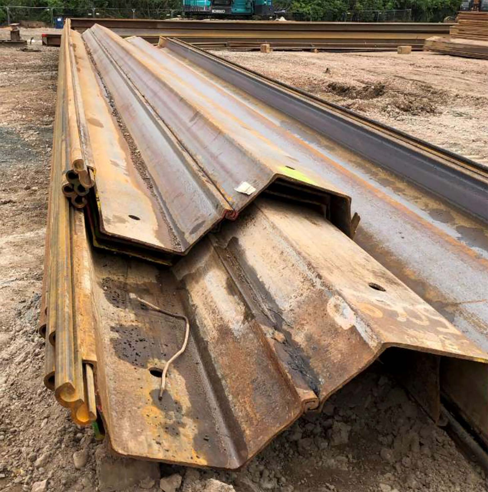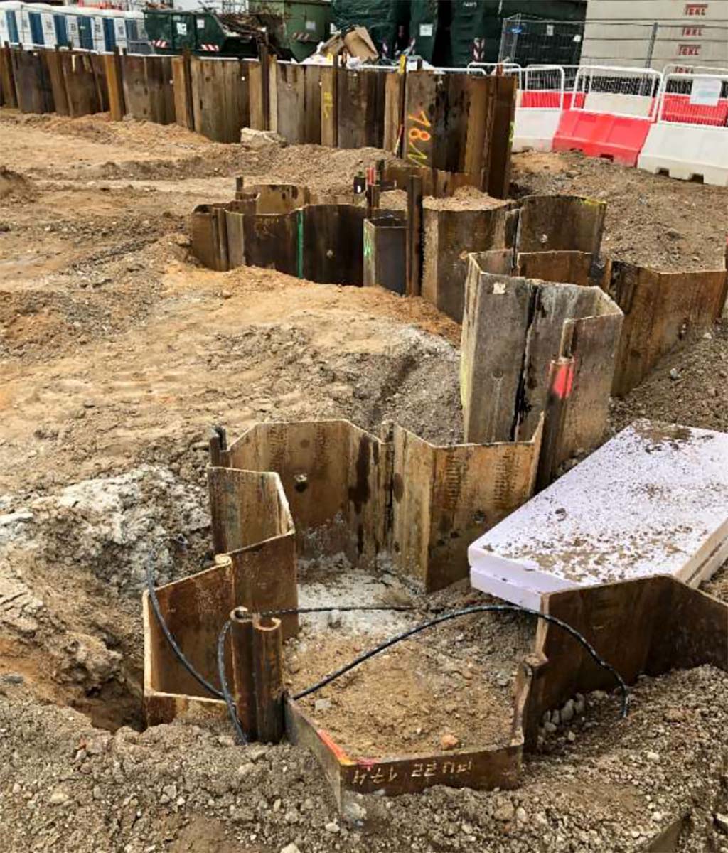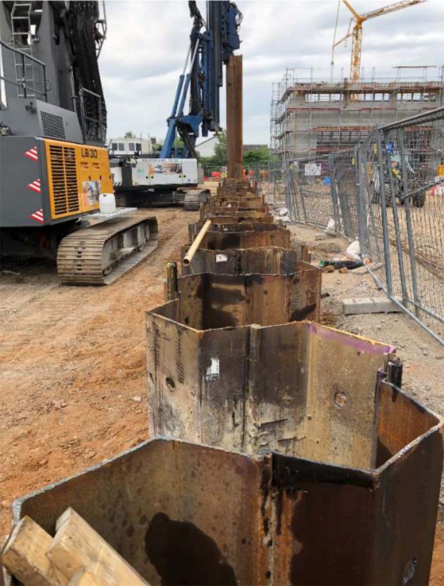 Der Spundwandverbau wurde im innovativen „Jagged-Wall“-Verfahren ausgeführt. Dies ermöglichte den Verzicht auf Anker und führte nicht nur zu erheblichen Zeit- und Kosteneinsparungen, sondern reduzierte auch die Lärmbelästigung für die umliegende Nachbarschaft spürbar. Zudem wurden zur Verbindung der Spundwände Omega-Schlösser verwendet, die bereits ab Lager mit einer einfachen Heftnaht verschweißt wurden. Dies erleichtert den späteren Rückbau sowie die Wiederverwendung der Spundwände.