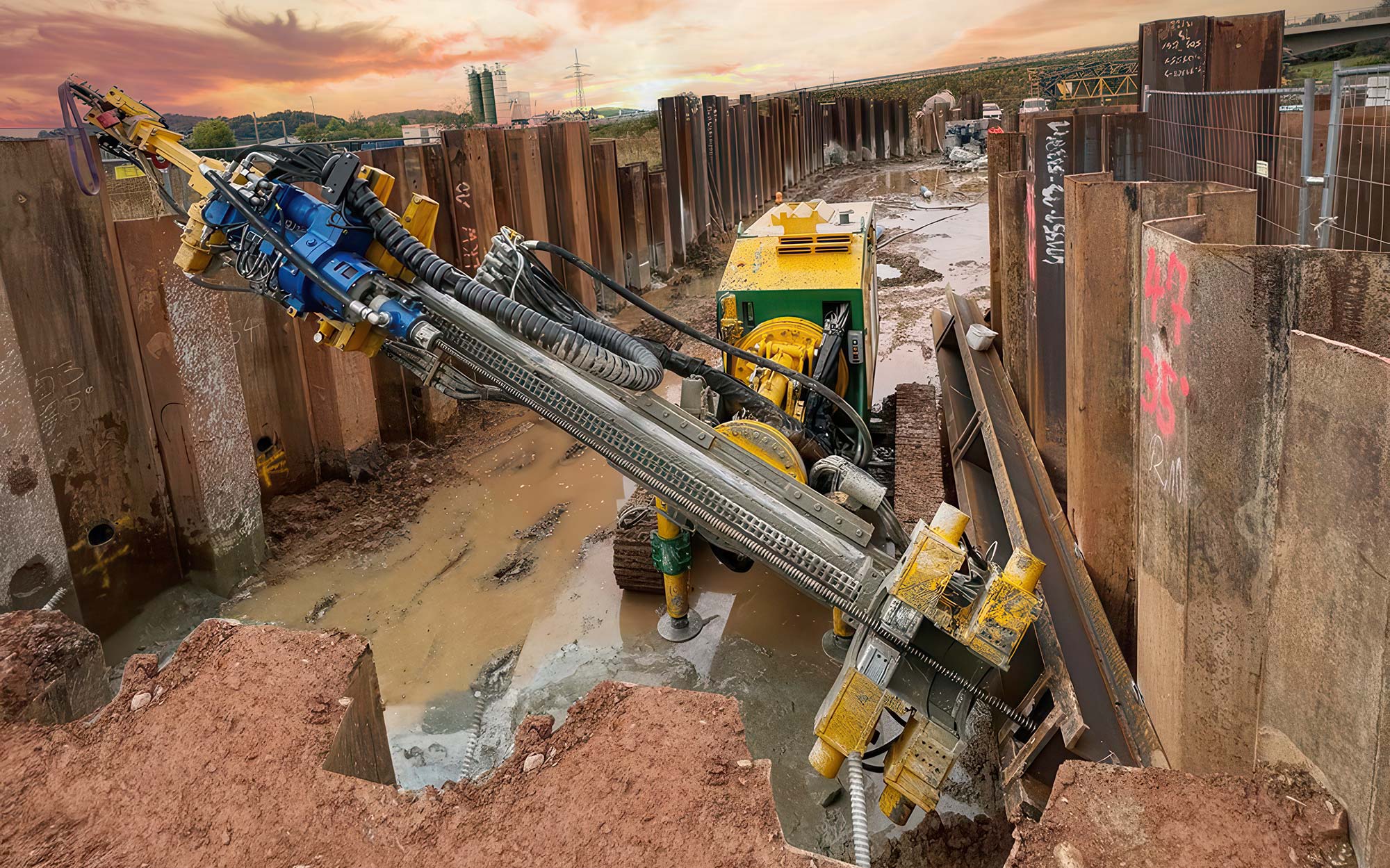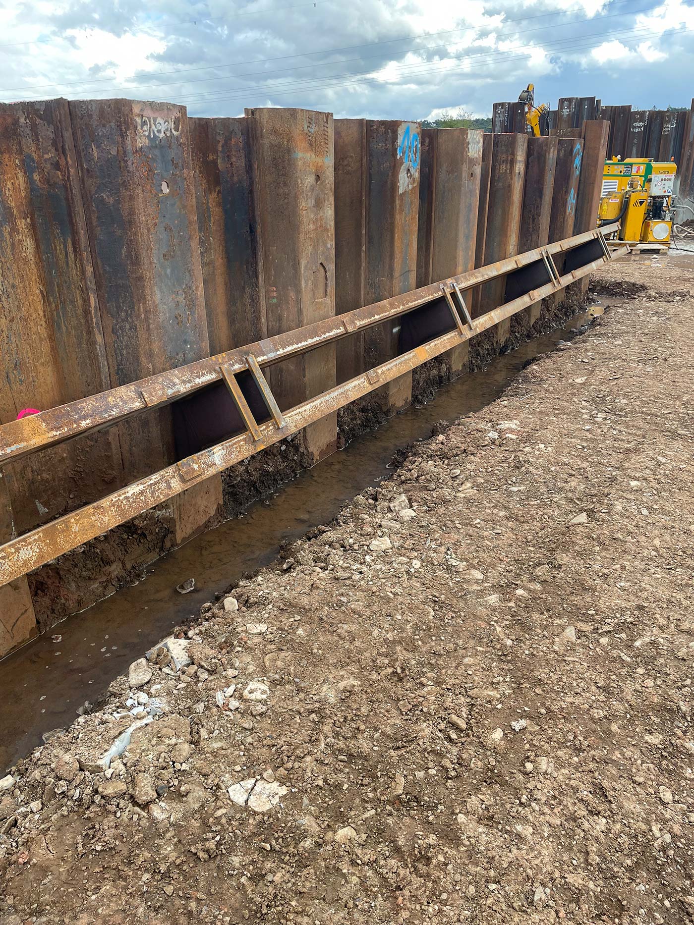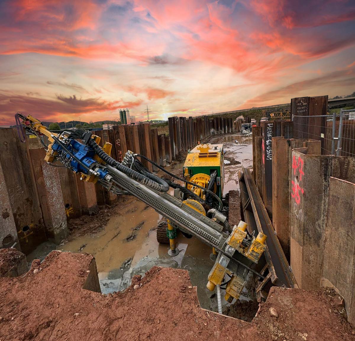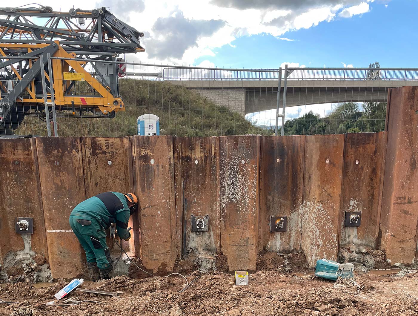 Lahntal – Herstellung von Mikropfählen für Spundwandverbau sowie Erstellung eines Gurtungseinbaus.