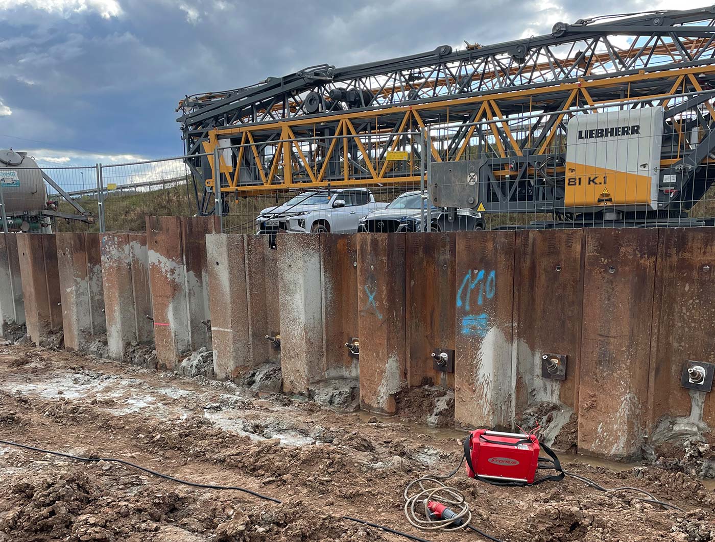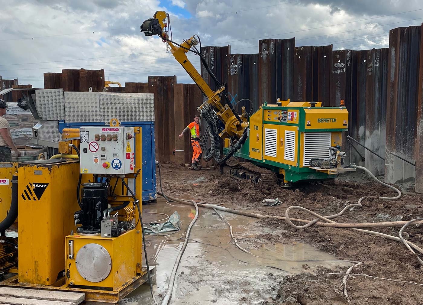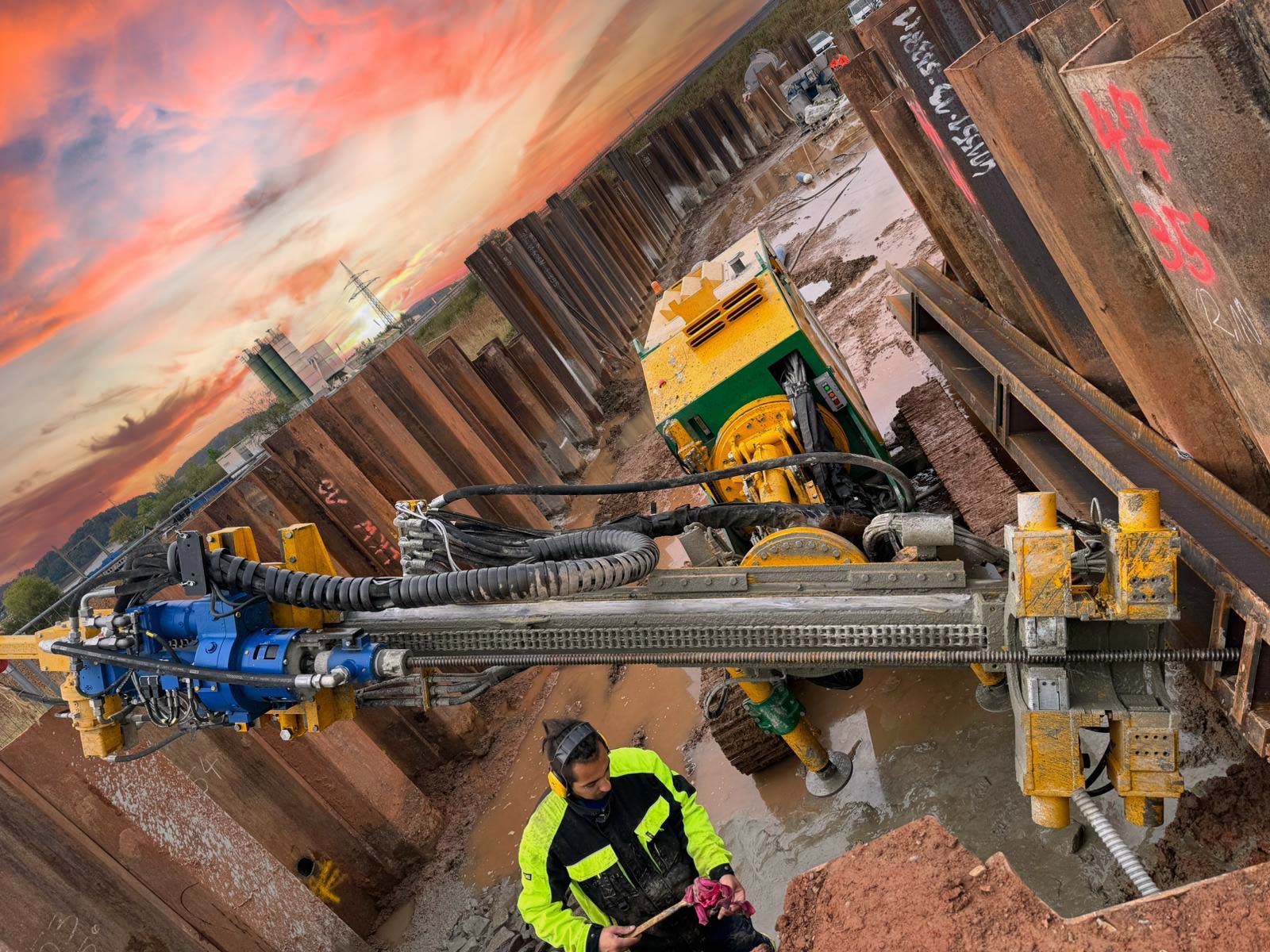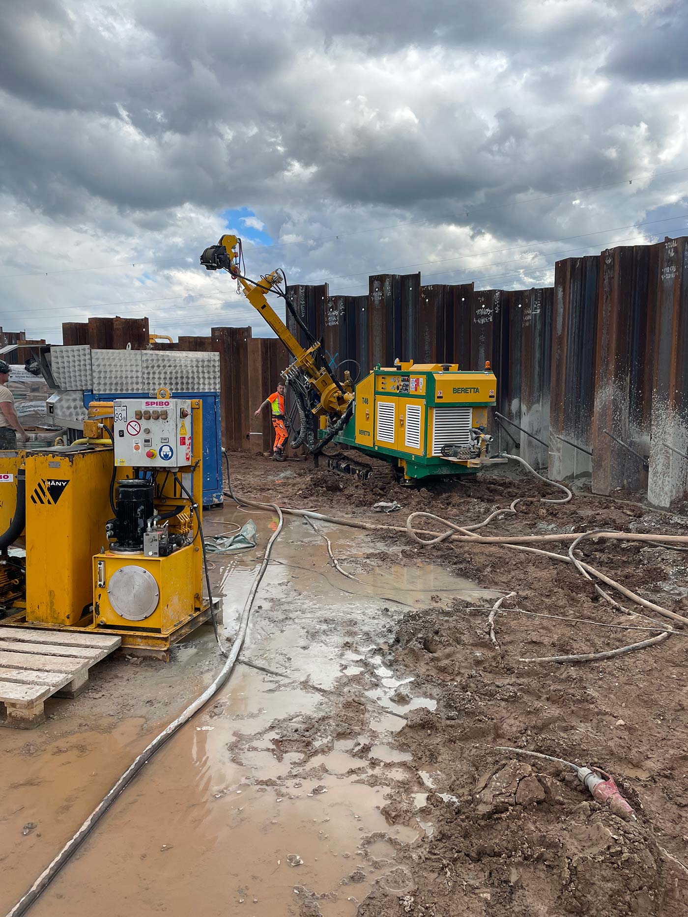 Unter schwierigen Witterungsbedingungen wurden für den Spundwandverbau insgesamt 117 Verbauanker Ischebeck TITAN 40/20 hergestellt. Länge jeweils 10-15 m. Ausserdem wurde ein Gurtungseinbau erstellt. Zum Einsatz kam ein Ankerbohrgerät BERETTA T48 als Mietgerät mit Bedienpersonal.
