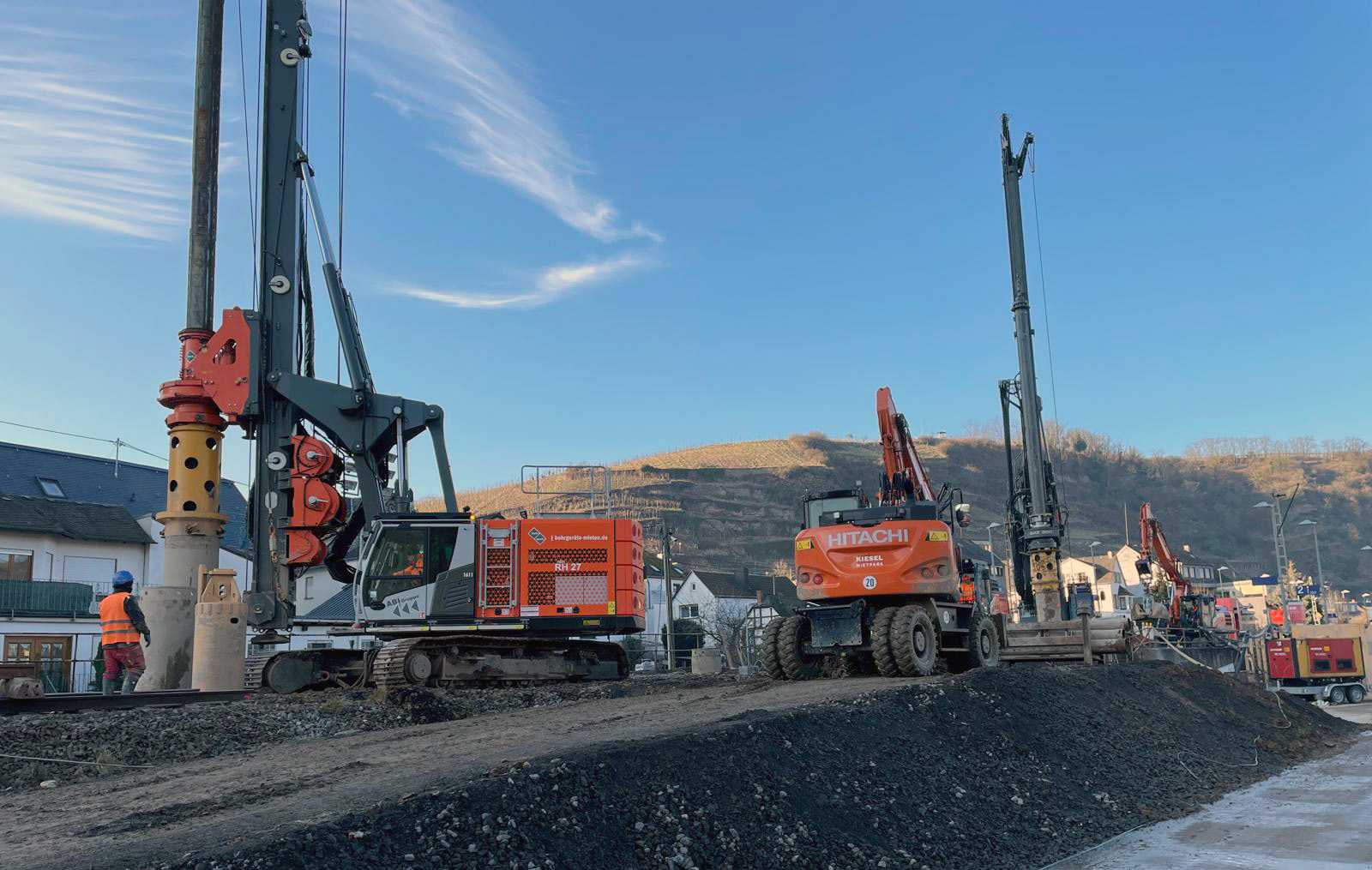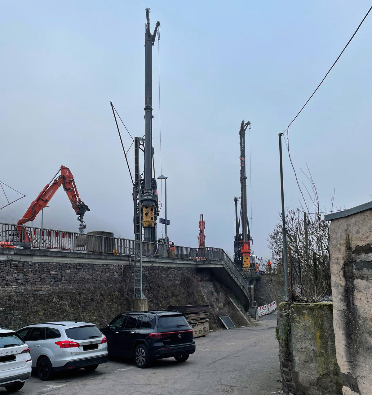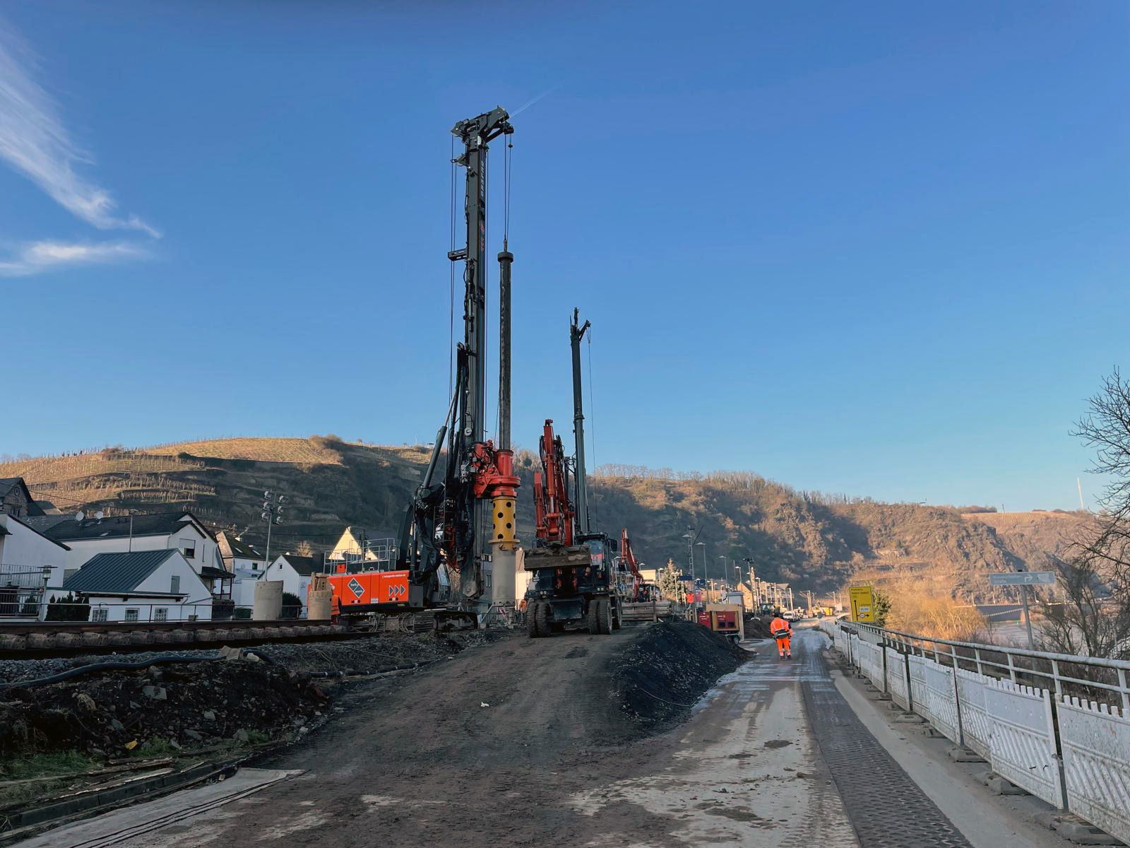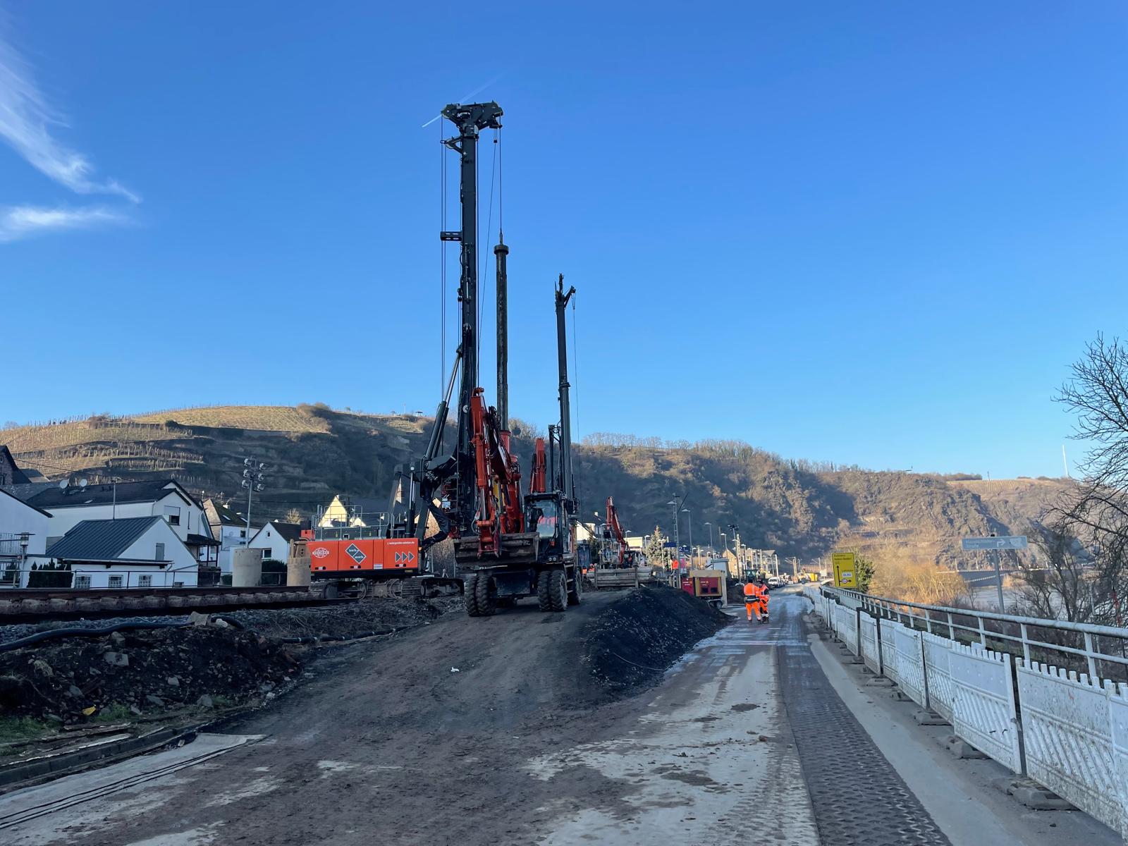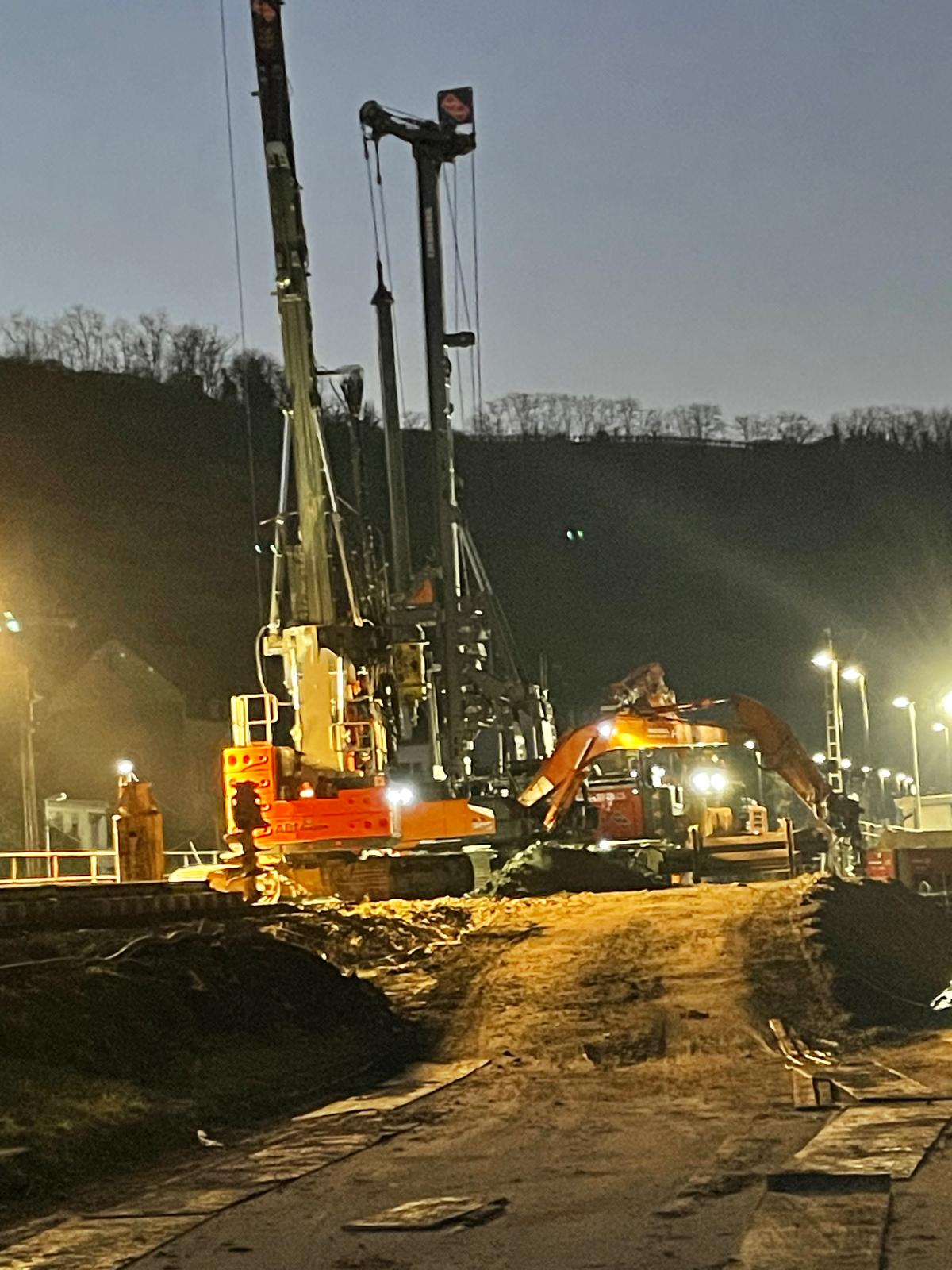 Im Zuge der ersten Bahnsperrpause erstellte die SFS International GmbH für den Verbau insgesamt 15 Bohrungen mit einem Ø von 880 mm und einer Länge von ca. 18 m zum Einstellen von Stahlträgern HEB 550. Im Anschluss wurden 13 Stahlplatten (1,50 x 5,00 m) eingerüttelt.