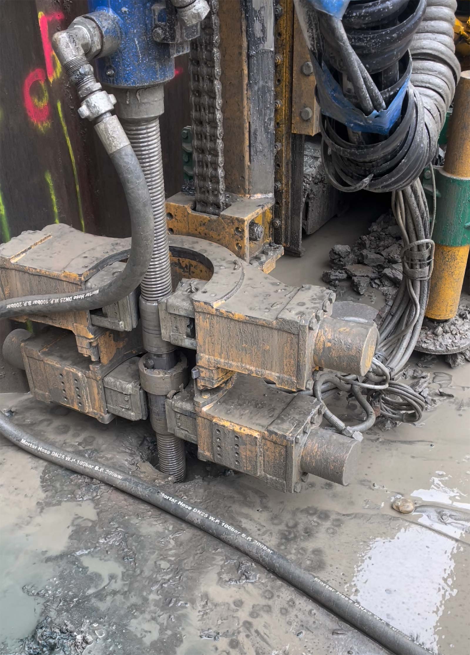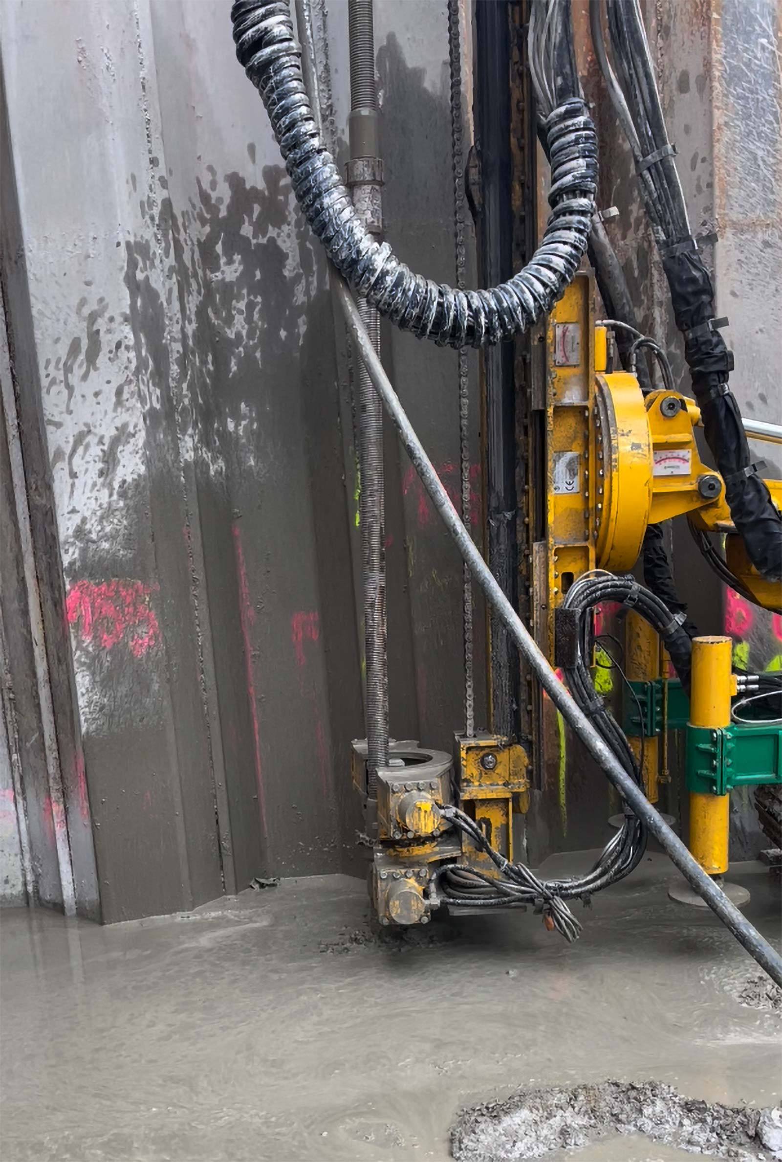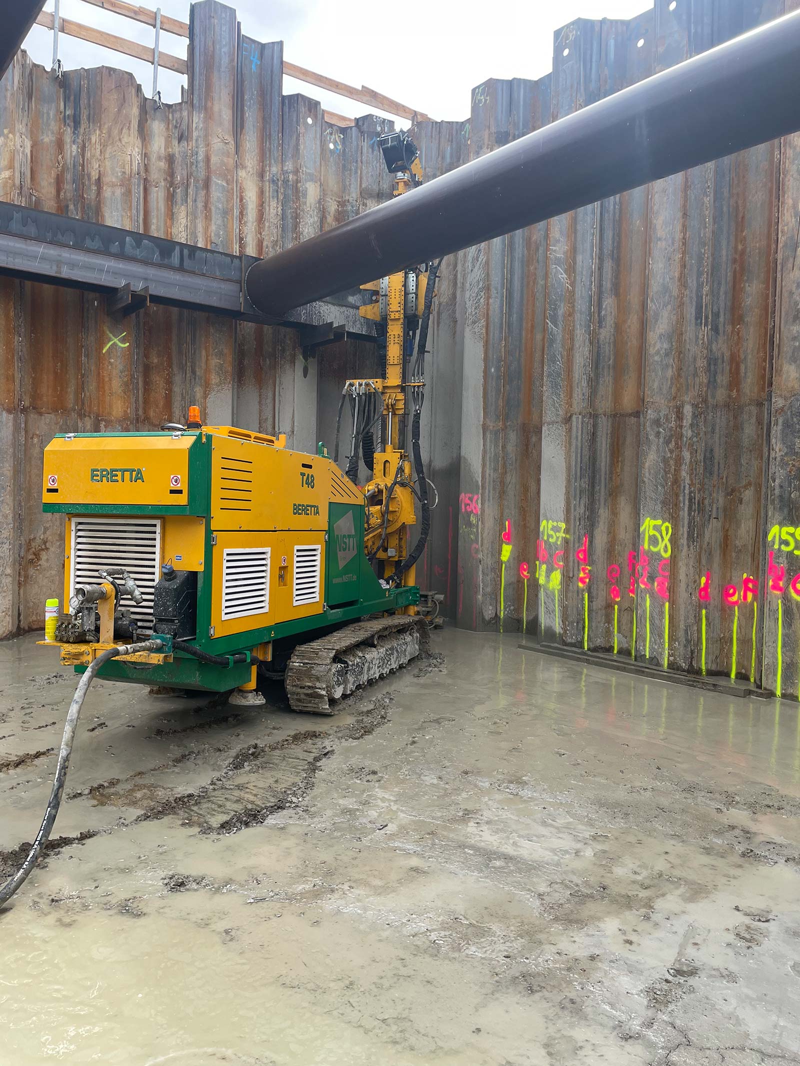 Mittels einem Ankerbohrgerät Beretta T48 und 100fachem Einsatz eines Ischebeck Titan Mikropfahls Ø 73 mm mit Bajonettverschlüssen wurde durch Zementverpressung für die nicht korrekt eingebrachte Spundwand ein Zementfuß erstellt. Der dadurch entstandene Unterfang der Baugrube dient unter anderem zur Abdichtung im Fußbereich der Spundwände.