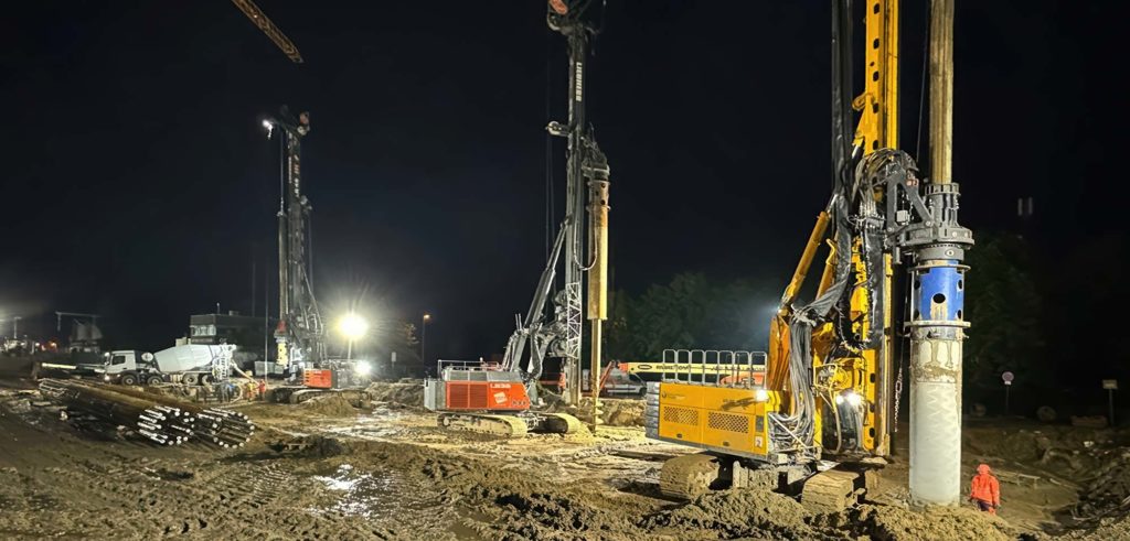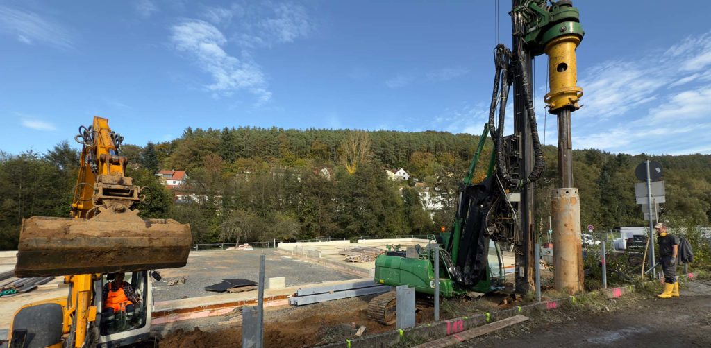 Stockstadt am Main – Zur Gründung sowie Bausicherung wurde eine aufgelöste Bohrpfahlwand bestehend aus 36 Ortbeton-Bohrpfählen im Kelly-Bohrverfahren erstellt.