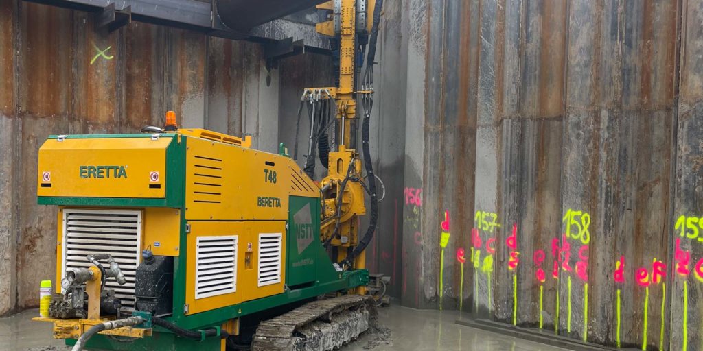 Deggendorf – Erstellung Zementfuß durch Zementverpressung im Fußbereich eines Spundbohlenverbaus mittels 100fachem Einsatz von Ischebeck Titan.